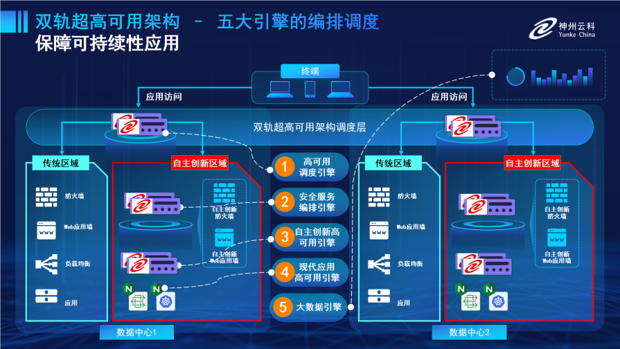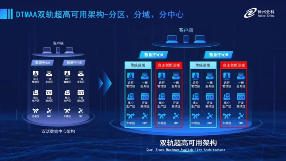 为帮助金融客户更好地应对数字经济时代对可持续性的高要求,实现“信创”与“数字化”齐头并进,710公海赌赌船官网推出了双轨超高可用架构。该架构在双活数据中心的分区调度基础上,增加信创域和非信创域的分域调度,实行信创域与传统域应用全量部署,使双中心运营变为双中心四区域并行运行,互为多活,将“0到1”的单轨建设道路变为分区分域协同的多活双轨超高可用架构。帮助客户在新架构下,保障“信创”的同时解决性能瓶颈,提升稳定性,保证应用可持续性,最终实现信创区域和非信创区域的平滑过渡,完成国产化替代目标。